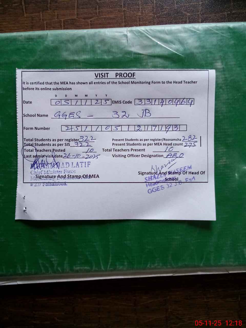 | Attendance Register | Head Teacher | MEA with School | Visit Proof |