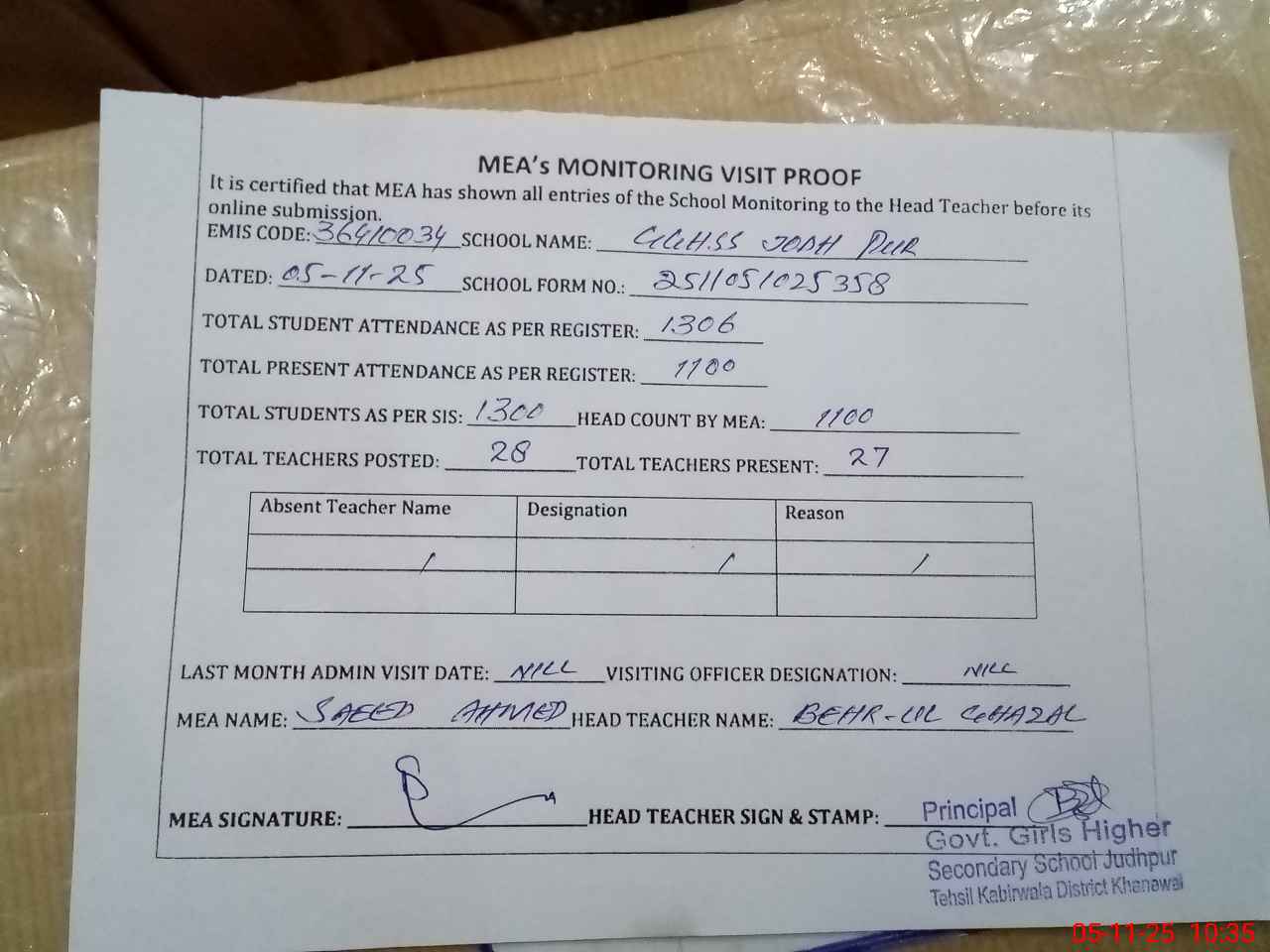 | Attendance Register | Head Teacher | MEA with School | Visit Proof |