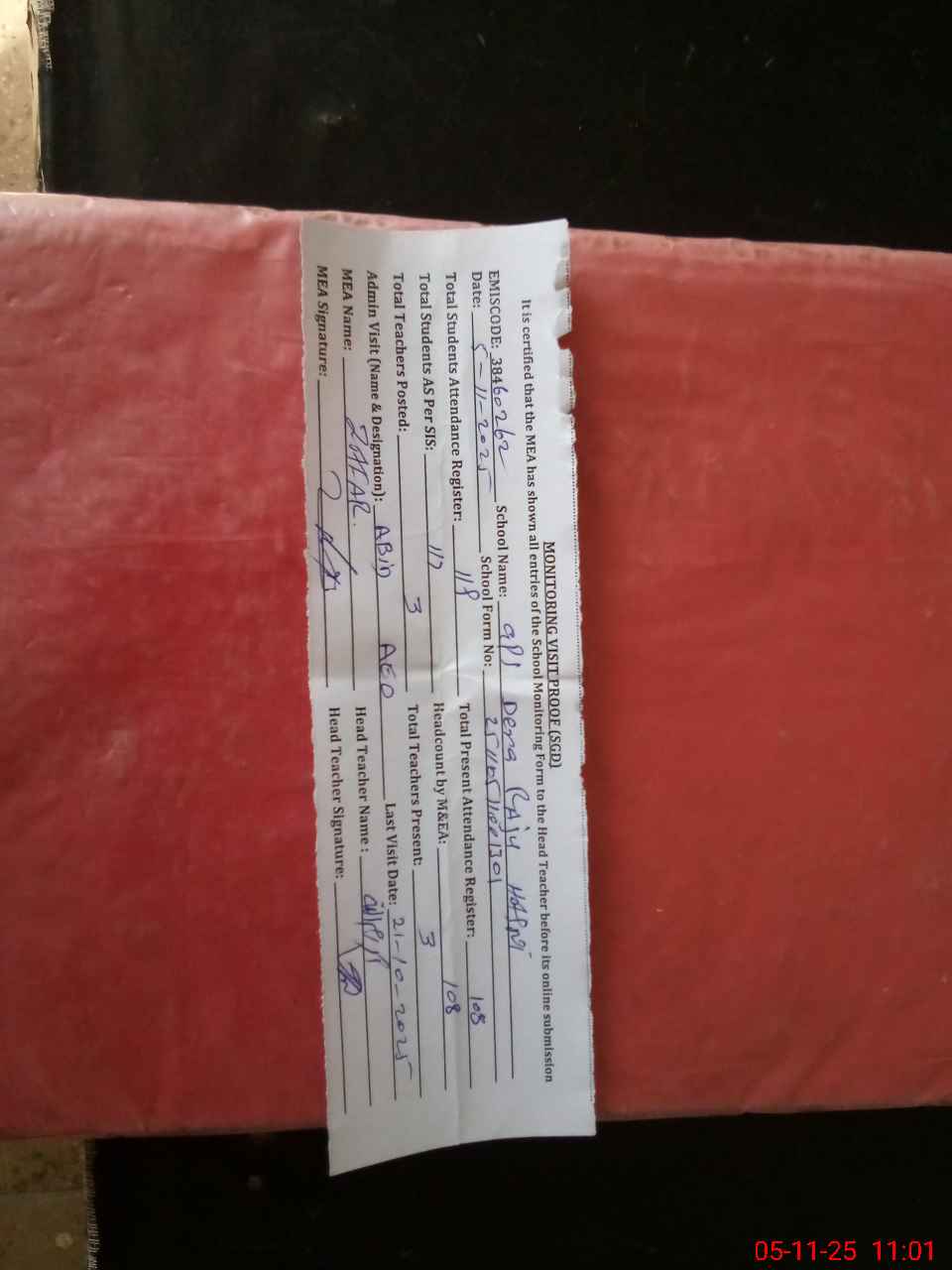 | Attendance Register | Head Teacher | MEA with School | Visit Proof |