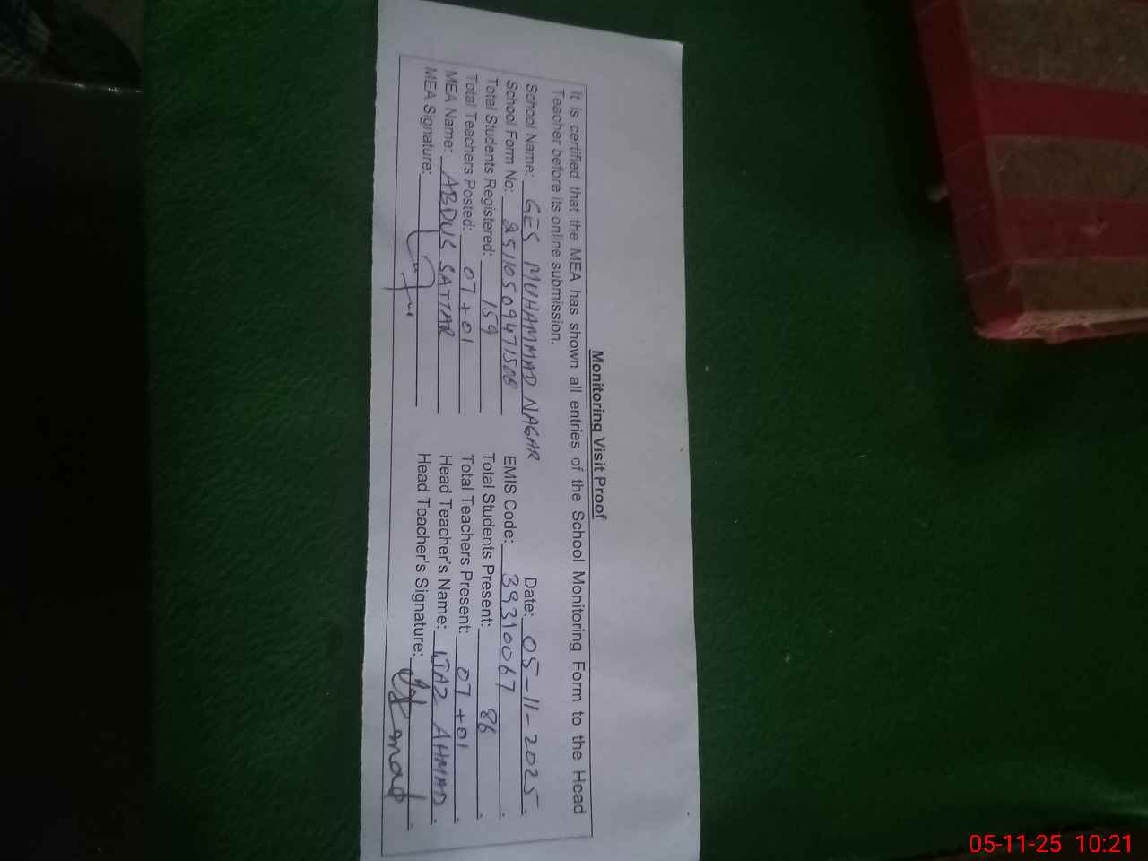 | Attendance Register | Head Teacher | MEA with School | Visit Proof |