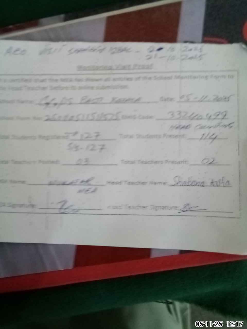 | Attendance Register | Head Teacher | MEA with School | Visit Proof |