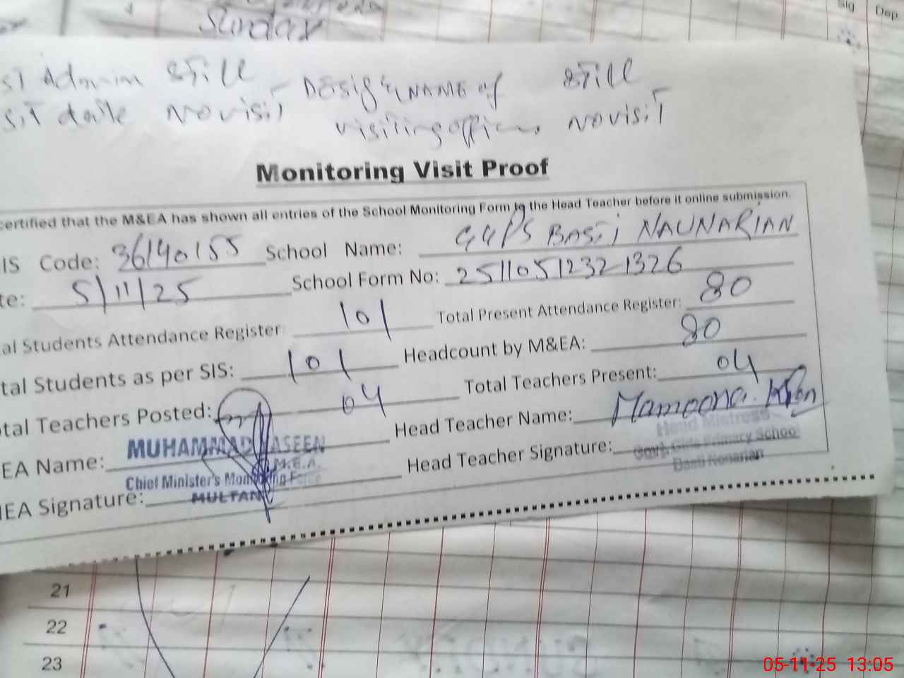 | Attendance Register | Head Teacher | MEA with School | Visit Proof |