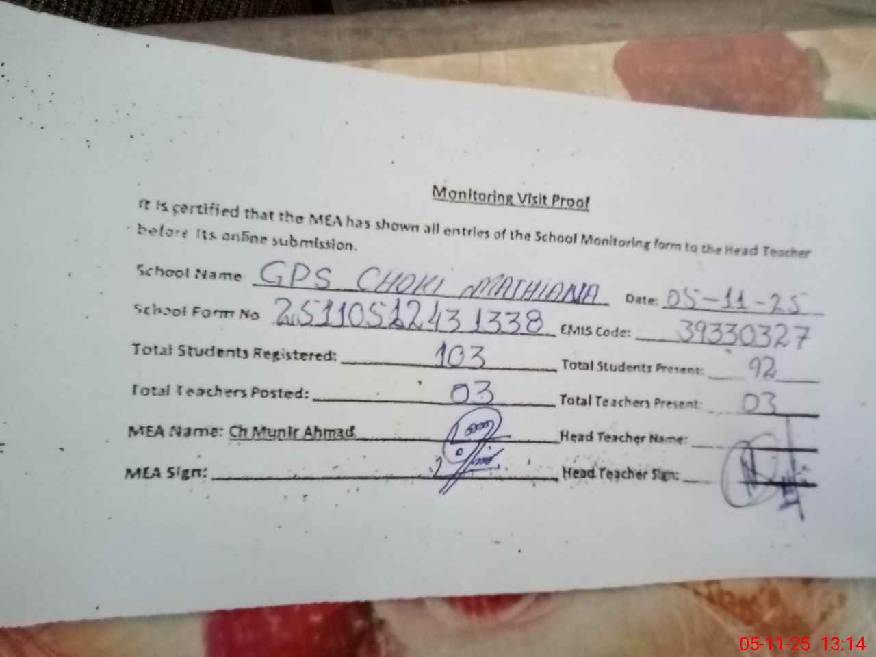 | Attendance Register | Head Teacher | MEA with School | Visit Proof |