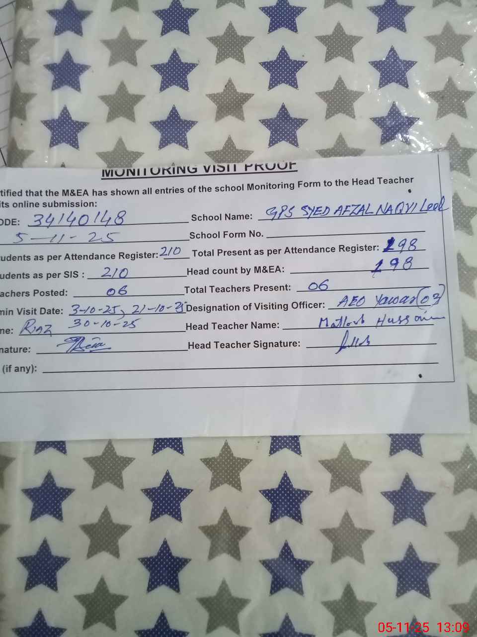 | Attendance Register | Head Teacher | MEA with School | Visit Proof |