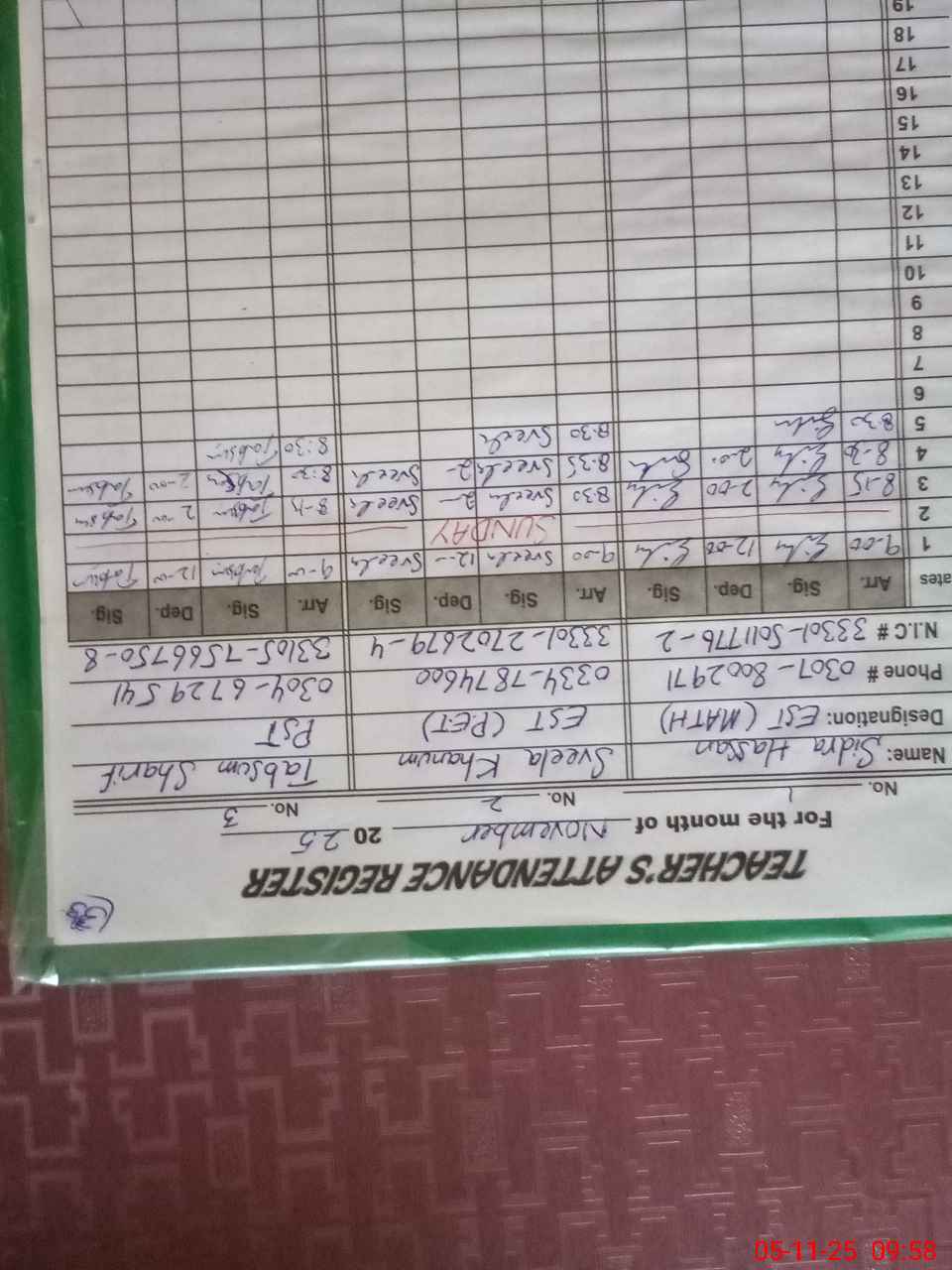 | Name: SI**** HA**** Designation: (School Headmaster's/Headmistress's) EST (MATH) Phone/Cell Number: 03**** |