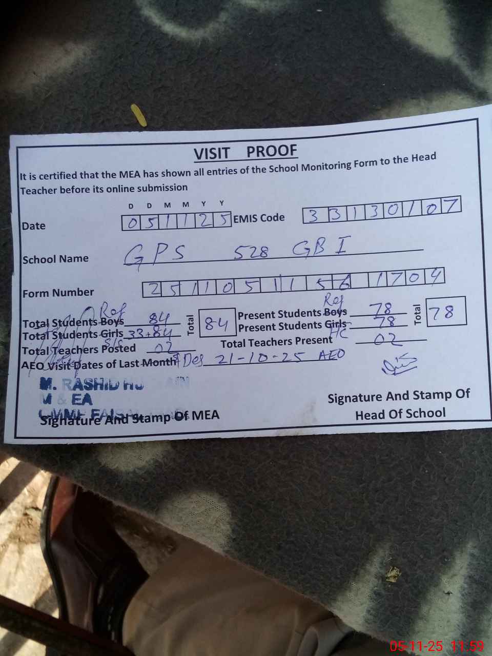 | Attendance Register | Head Teacher | MEA with School | Visit Proof |