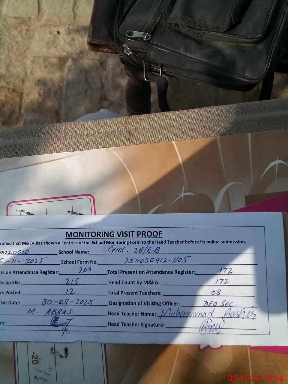 | Attendance Register | Head Teacher | MEA with School | Visit Proof |