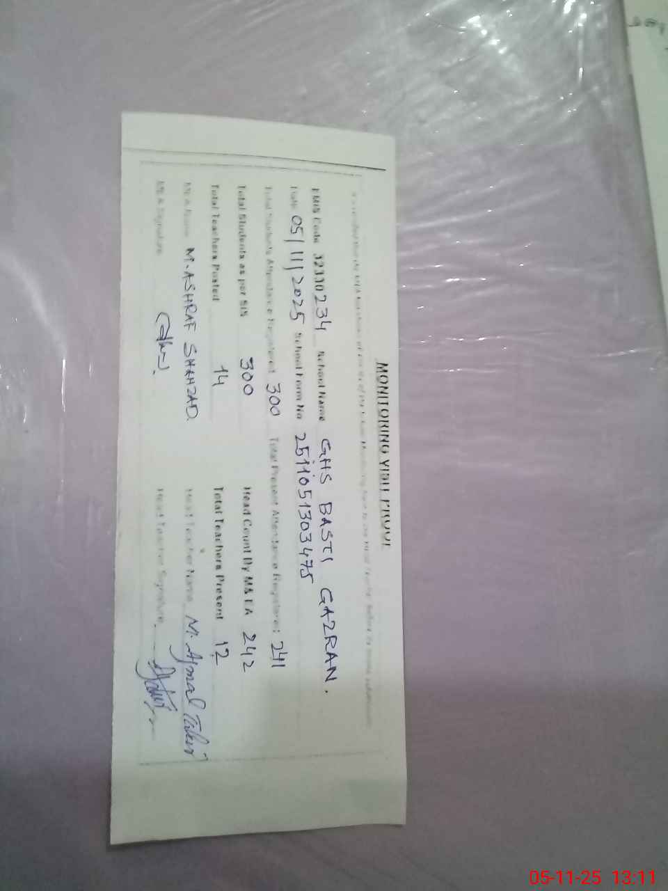 | Monitoring Date: 05-11-2025 | Start Time: 05-11-2025 12:09 PM | End Time: 05-11-2025 01:20 PM | Name of MEA: Mu**** As**** Sh**** | |