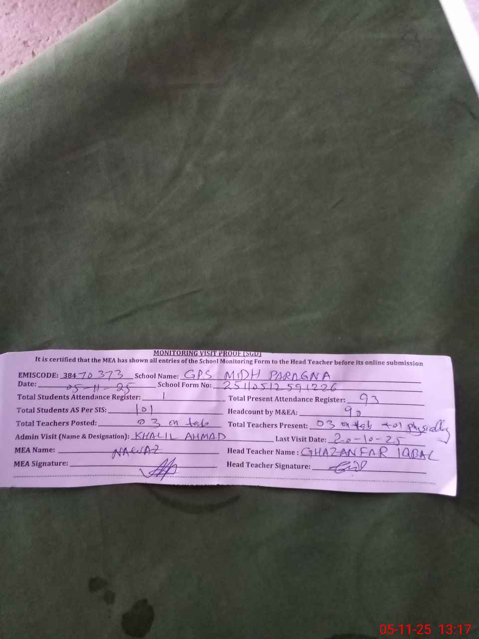 | Attendance Register | Head Teacher | MEA with School | Visit Proof |