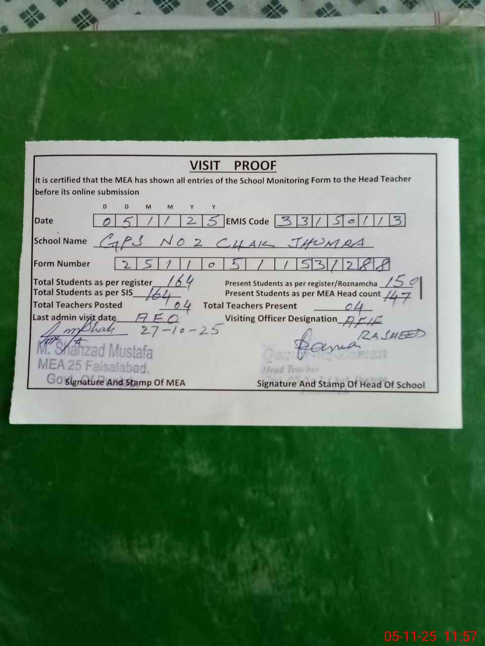 | Attendance Register | Head Teacher | MEA with School | Visit Proof |