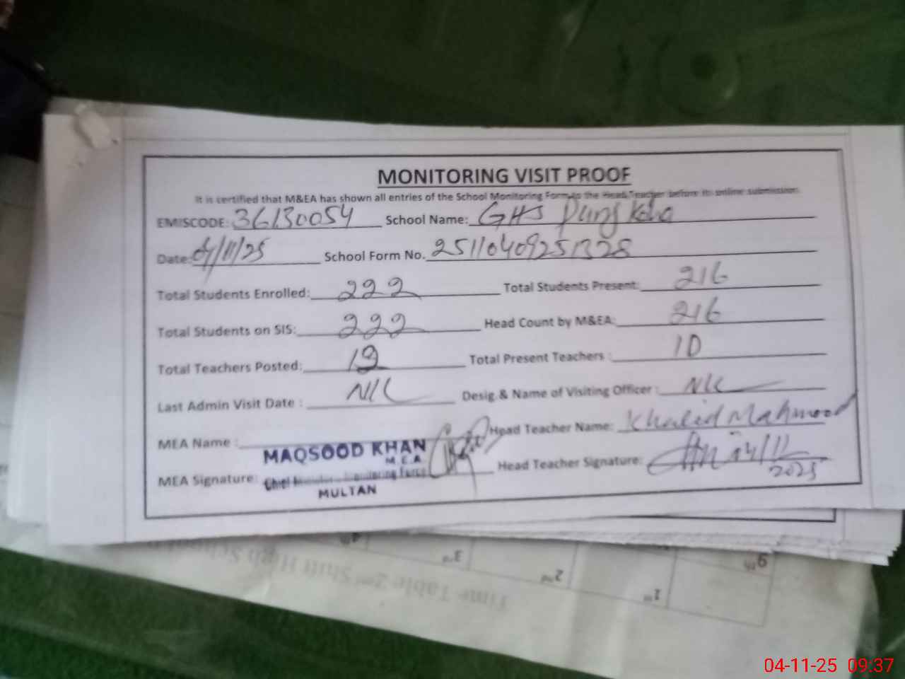 | Monitoring Date: 04-11-2025 | Start Time: 04-11-2025 09:15 AM | End Time: 04-11-2025 09:38 AM | Name of MEA: MA**** ULHA**** KH**** | |