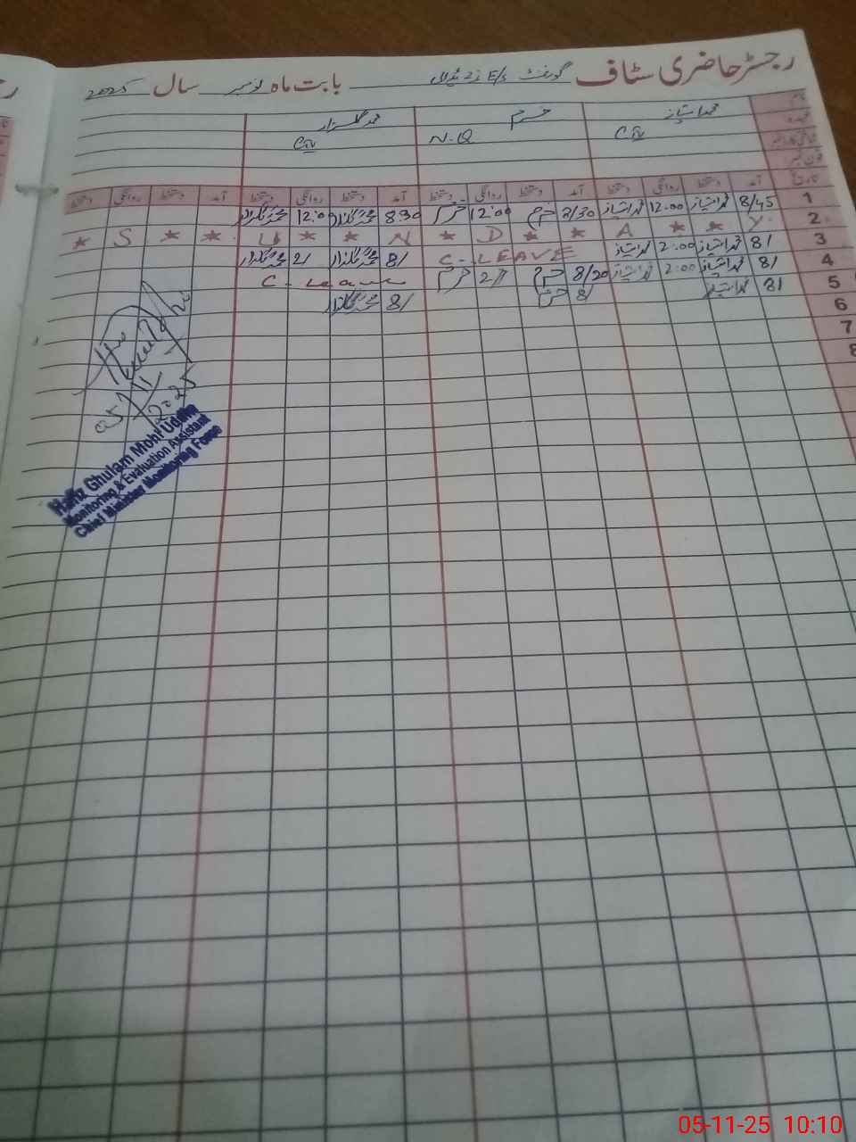 | CNIC | Full Name | Designation | R/C | Absence during last cal. month |