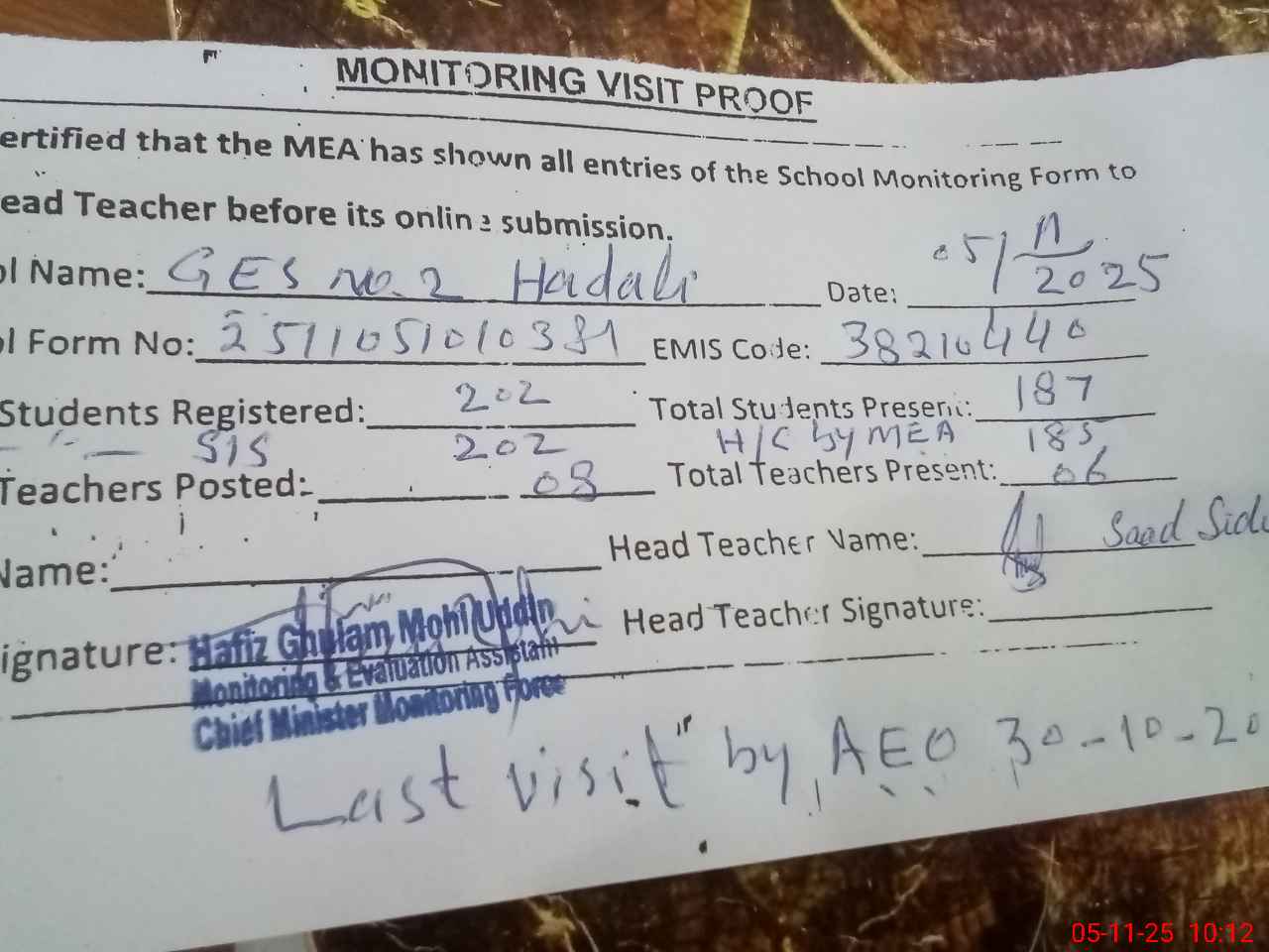 | Remarks (Use Separate Page if Required): Last visit by AEO on dt 30 October 2025 | |||||