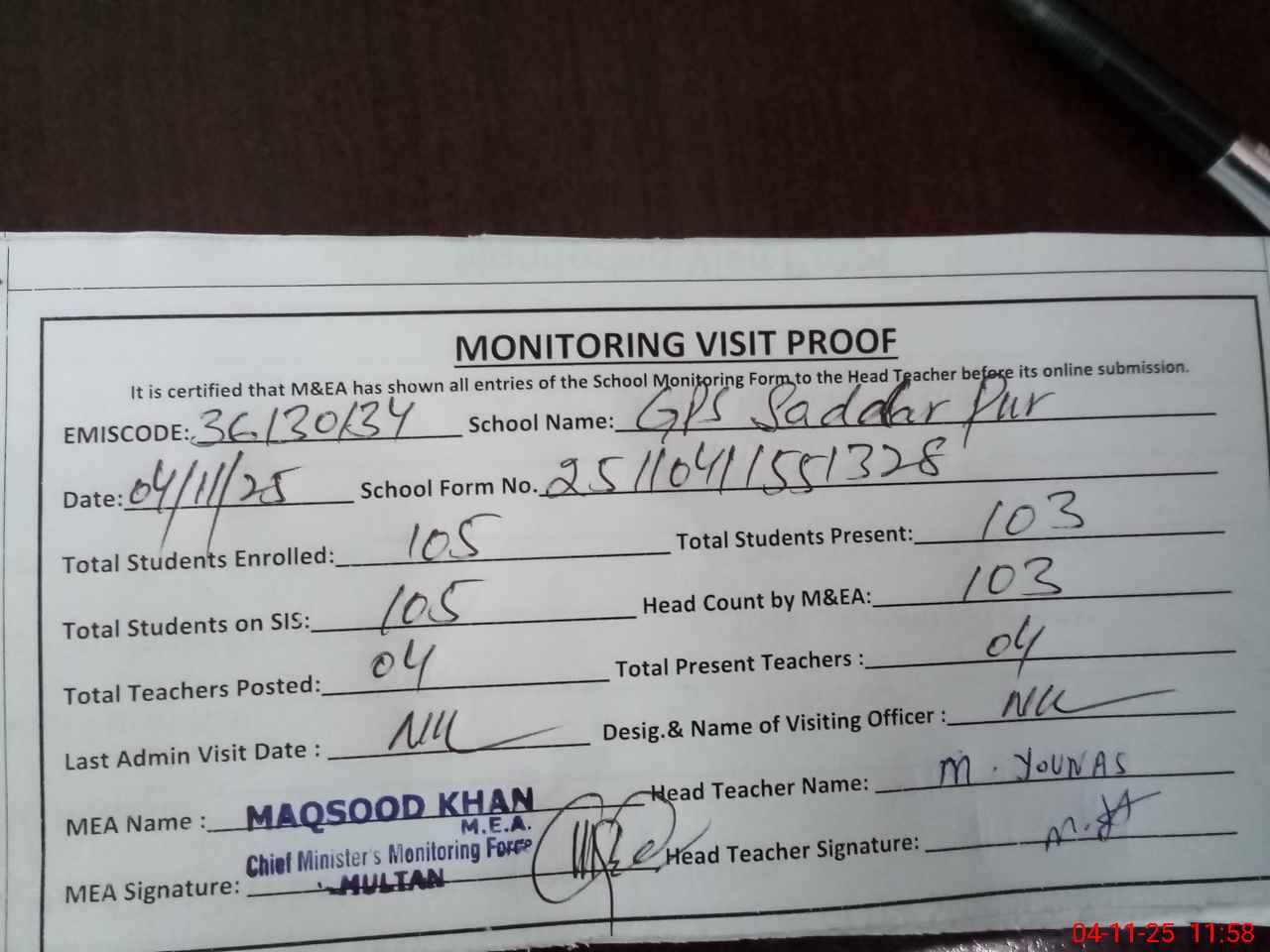 | EMIS Code: 36130134 | Name of School: GPS SADDAR PUR MULTAN MOUZA SADDAR PUR MULTAN | |||