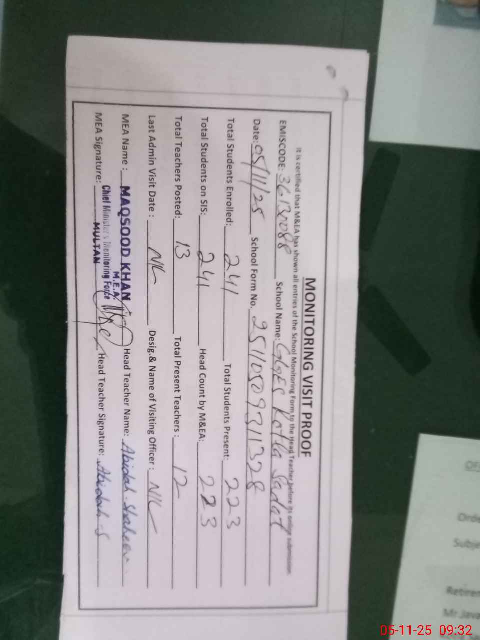| EMIS Code: 36130088 | Name of School: GGES KOTLA SADAT NEAR SADIQ ABAD MULTAN | |||