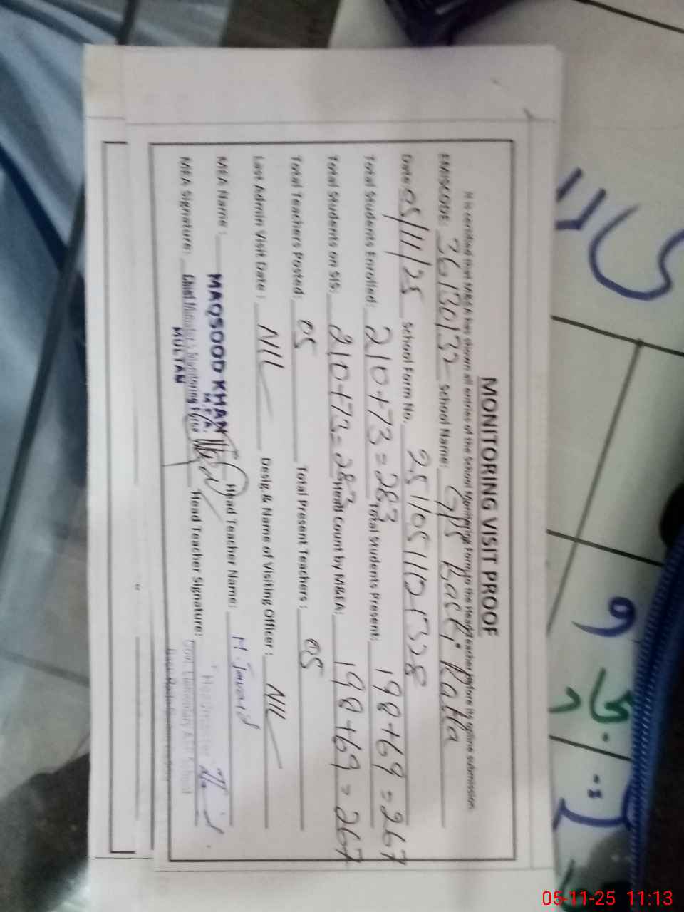 | Attendance Register | Head Teacher | MEA with School | Visit Proof |