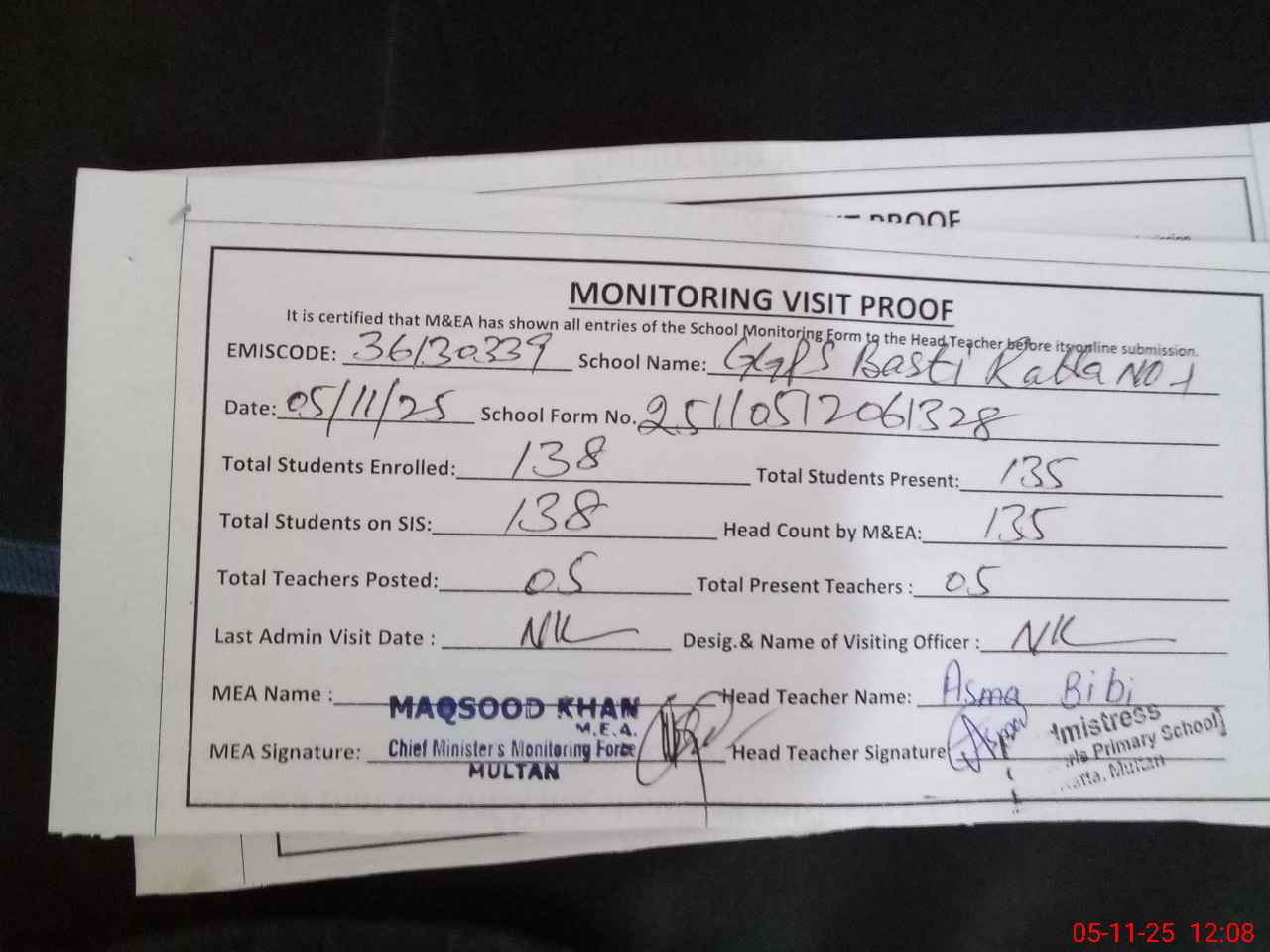 | Attendance Register | Head Teacher | MEA with School | Visit Proof |