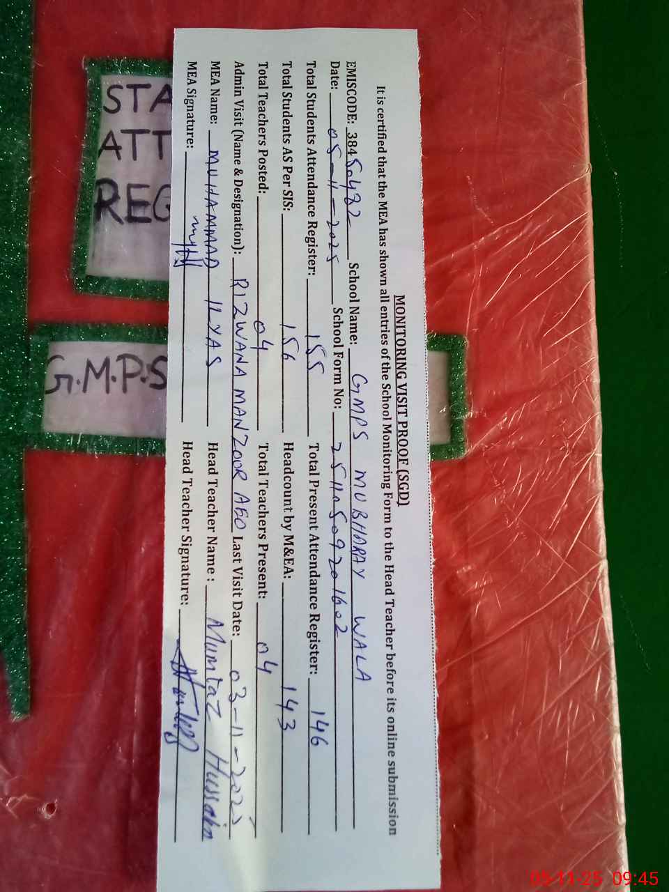 | Attendance Register | Head Teacher | MEA with School | Visit Proof |