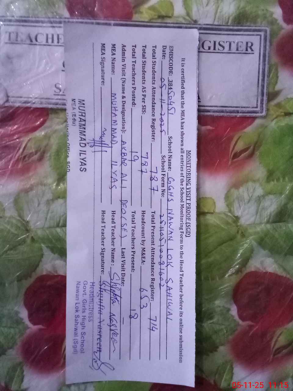 | EMIS Code: 38450451 | Name of School: GGHS NAWAN LOK SAHIWAL | |||