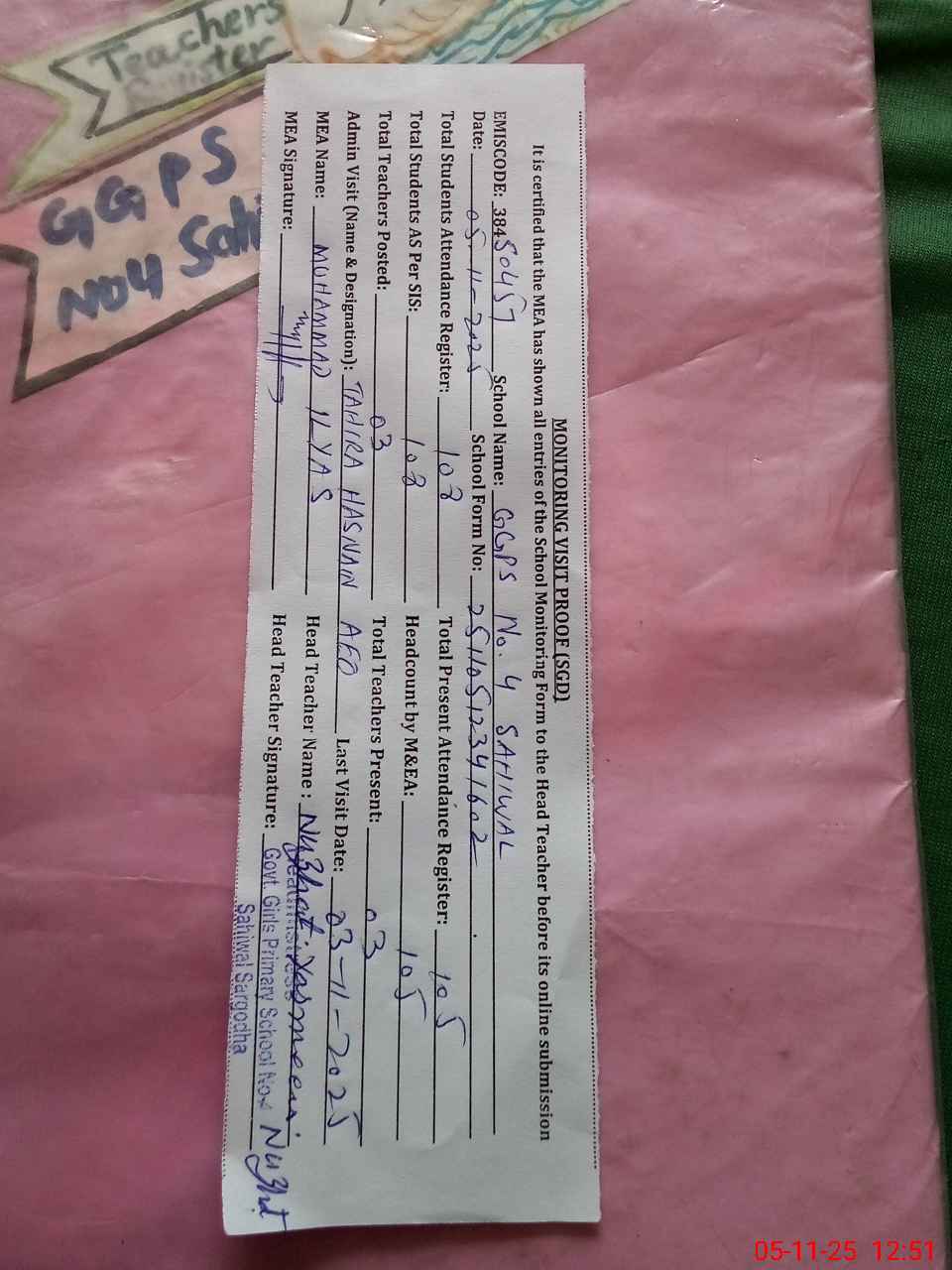 | EMIS Code: 38450457 | Name of School: GGPS NO.4 SAHIWAL | |||