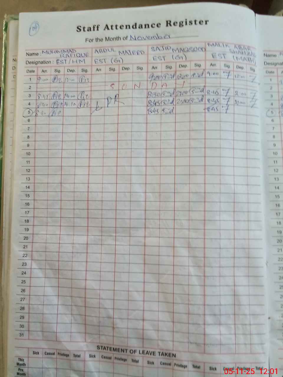 | CNIC | Full Name | Designation | R/C | Absence During Last Calender Month |