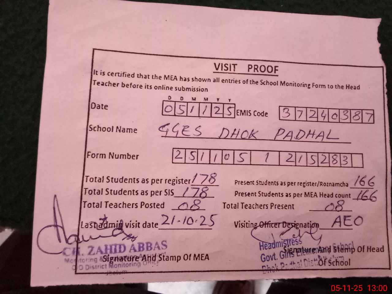 | EMIS Code: 37240387 | Name of School: GGES DHOK PADHAL | |||
