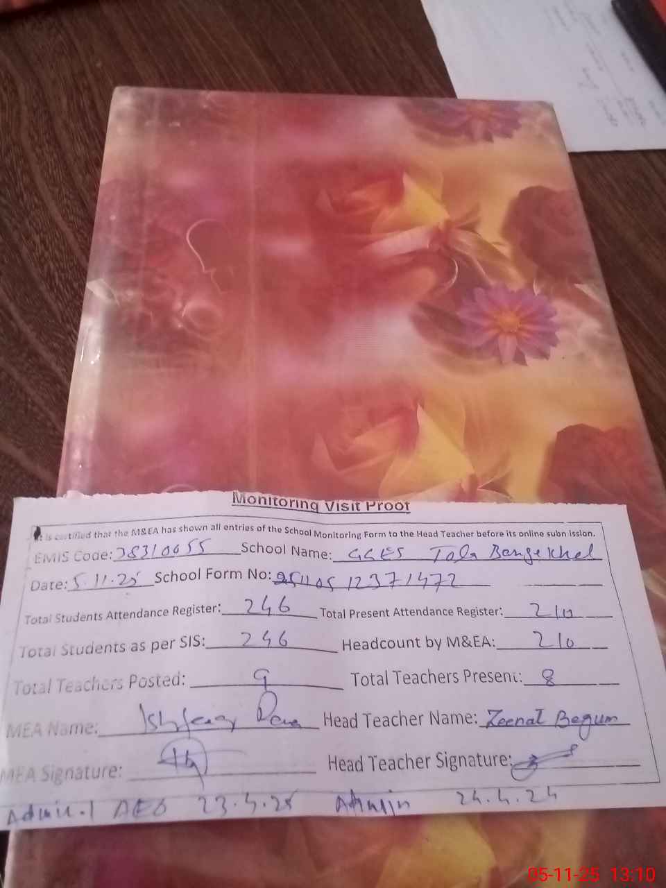 | Attendance Register | Head Teacher | MEA with School | Visit Proof |