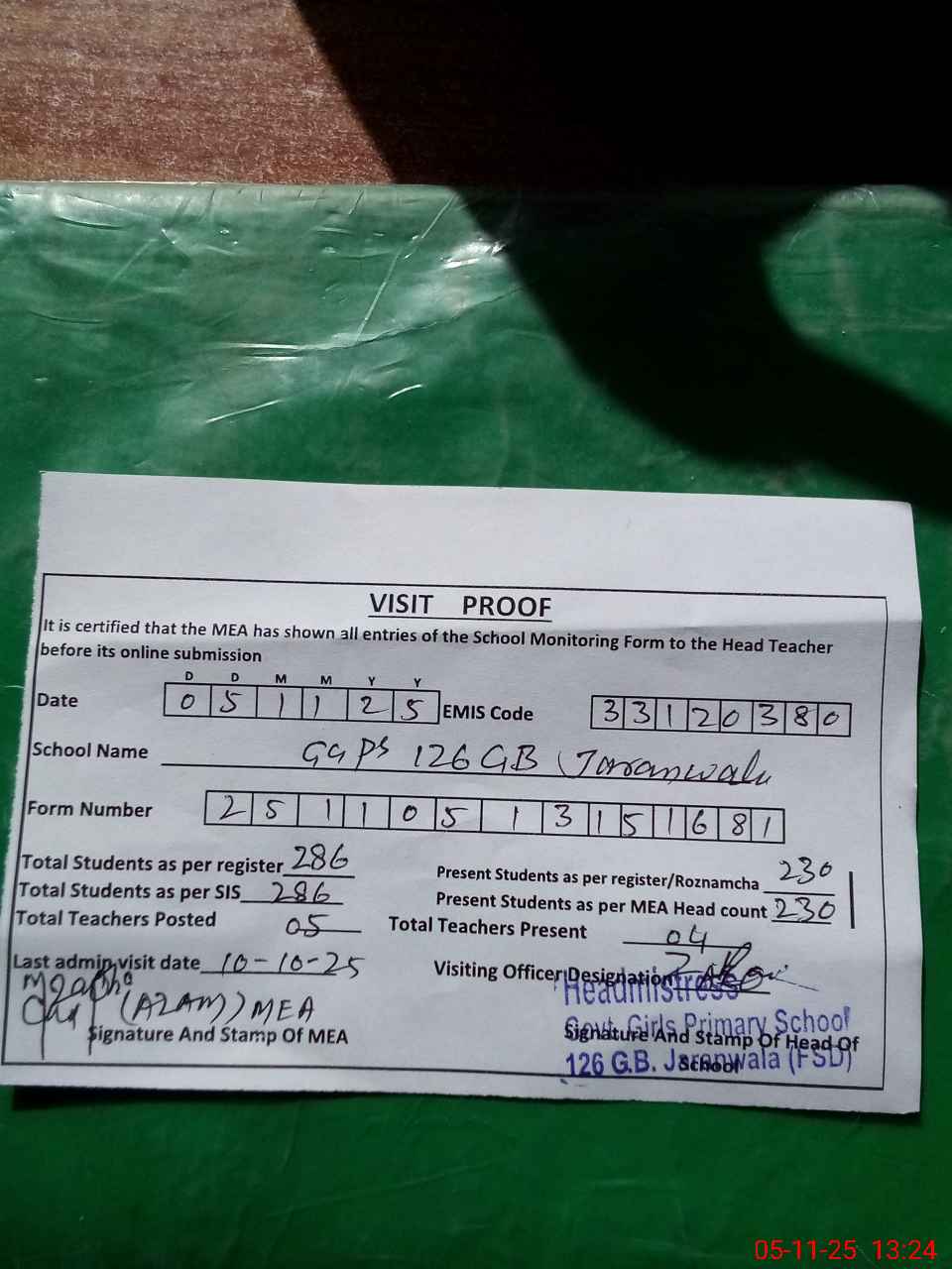 | Attendance Register | Head Teacher | MEA with School | Visit Proof |