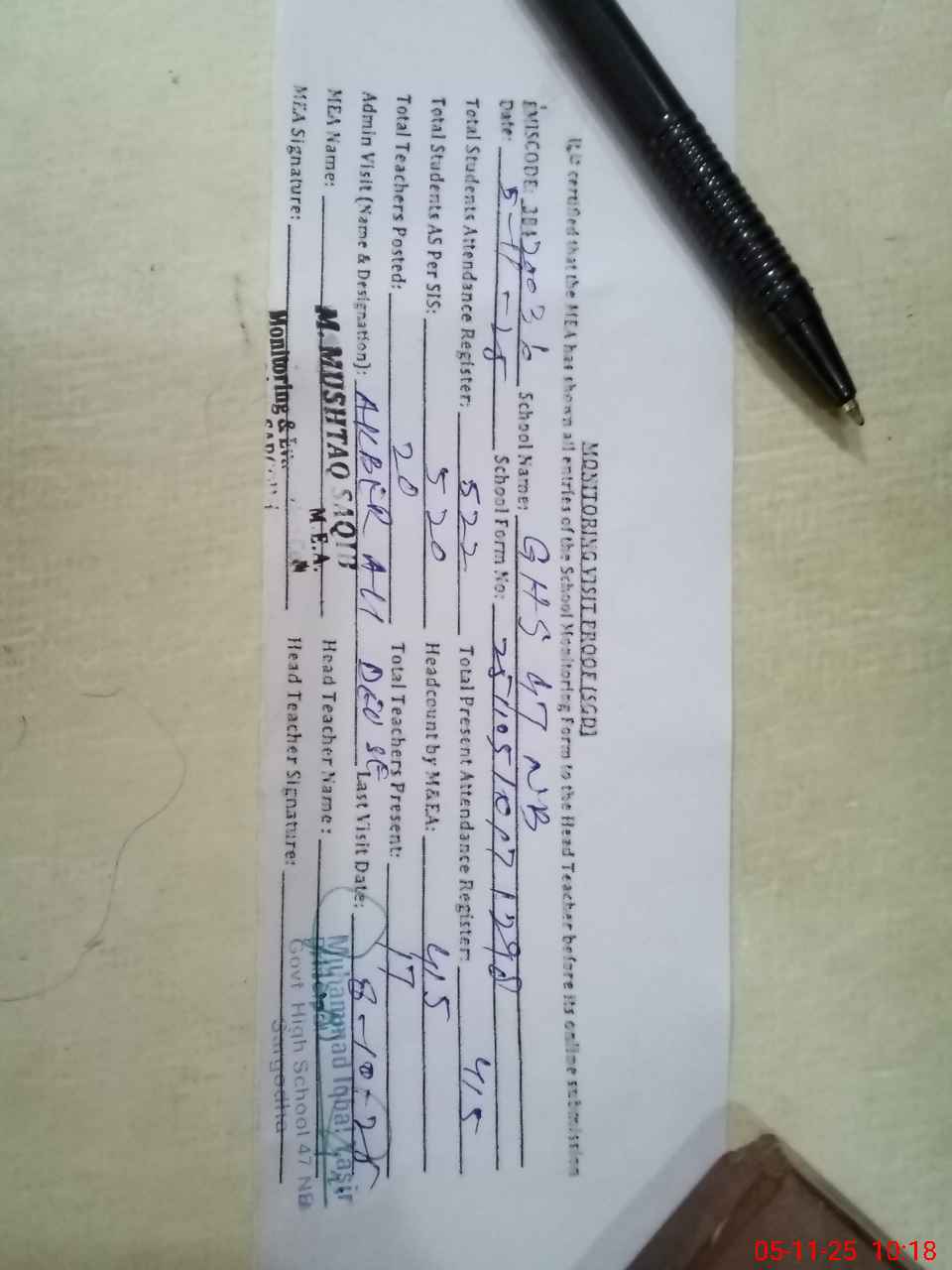 | Attendance Register | Head Teacher | MEA with School | Visit Proof |
