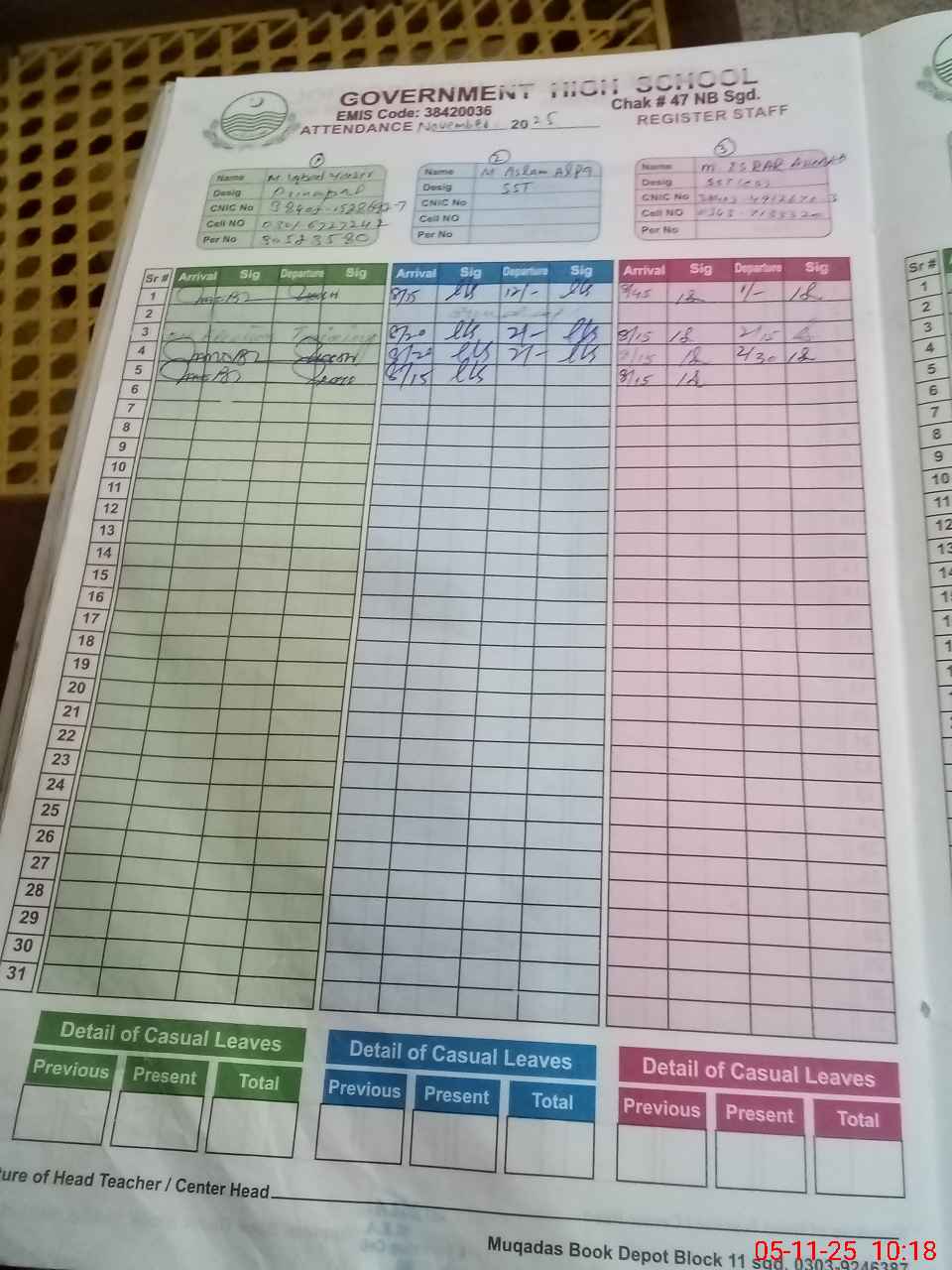 | CNIC | Full Name | Designation | R/C | Absence during last cal. month |