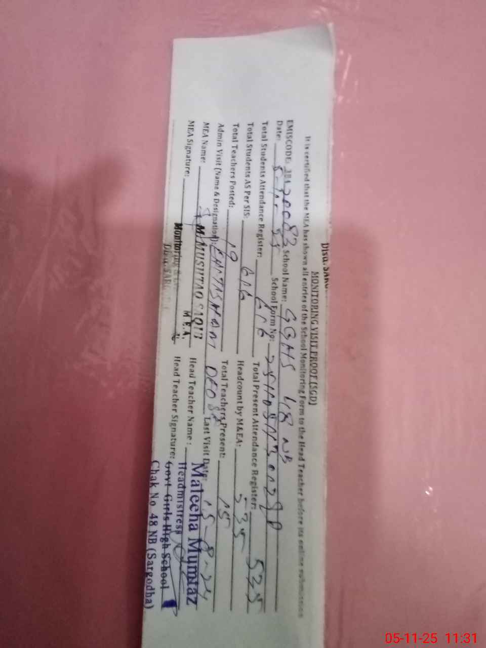 | Attendance Register | Head Teacher | MEA with School | Visit Proof |