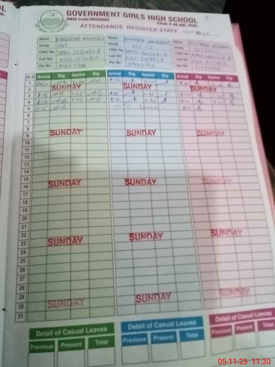 | CNIC | Full Name | Designation | R/C | Absence During Last Calender Month |