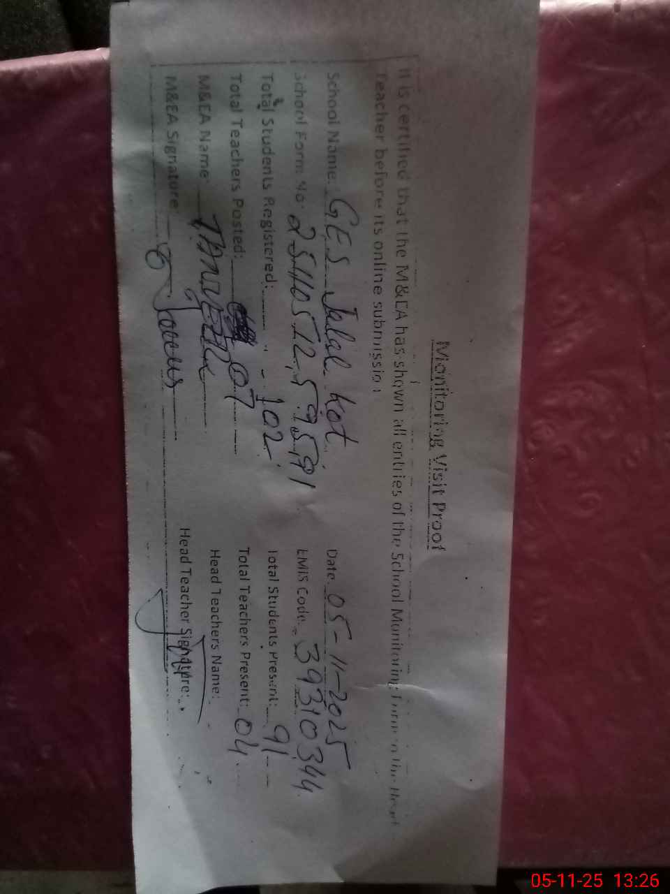 | EMIS Code: 39310344 | Name of School: GES JALAL KOT | |||