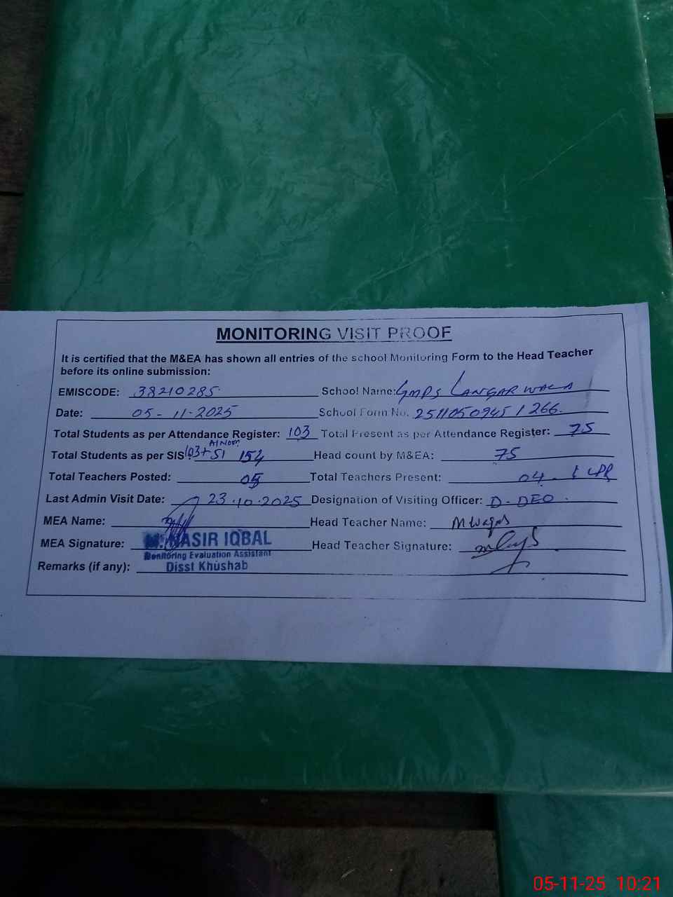 | Remarks (Use Separate Page if Required): No teacher absent last visit ddeo dated 2310 2025 | |||||