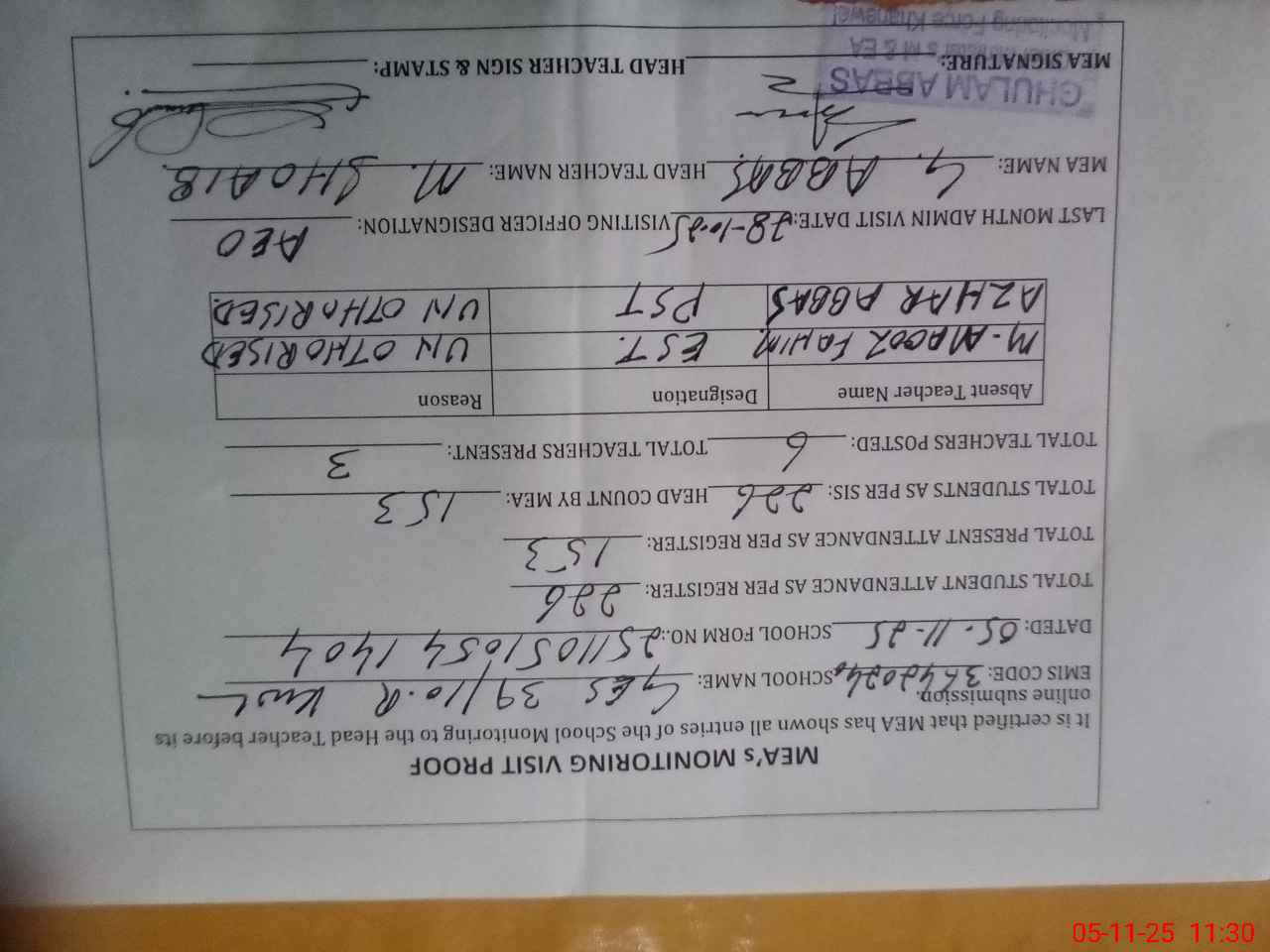 | Remarks (Use Separate Page if Required): Est m maooz fahim joined this school on 25 June 2025 but after this one day aatance was marked on 01 September 2025 after this there is no attandance in school with out any evidence of leave or any other duty Pst Azhar Abbas was absent from school with out any leave | |||||