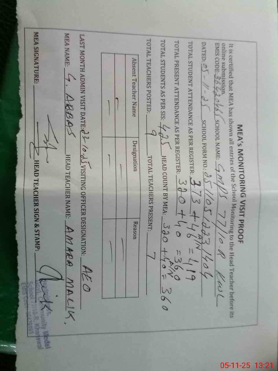 | Attendance Register | Head Teacher | MEA with School | Visit Proof |