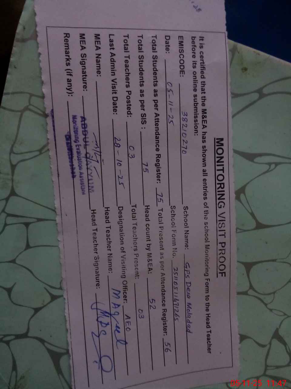 | EMIS Code: 38210270 | Name of School: GPS DERA MOLADAD | |||