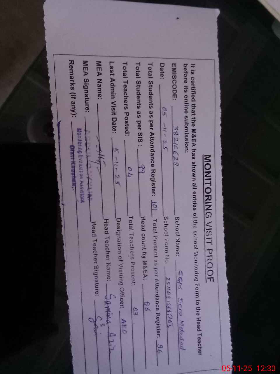 | Remarks (Use Separate Page if Required): Last visit by AEO on 05 Nov 2025 | |||||