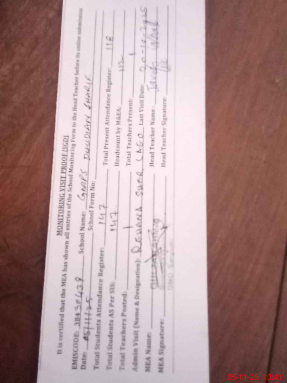 | Attendance Register | Head Teacher | MEA with School | Visit Proof |