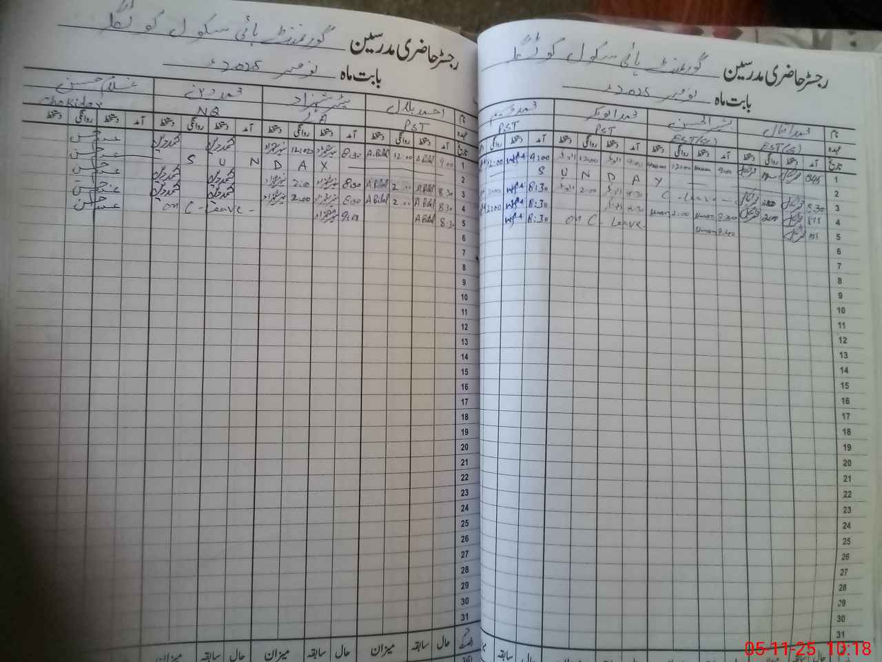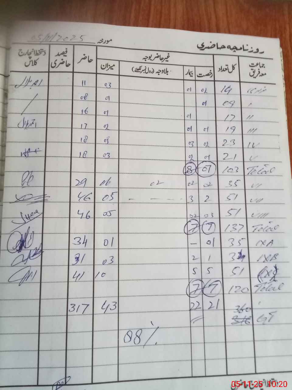 | Remarks (Use Separate Page if Required): Students attendance gap is very high False attendance written on roznamcha Poor cleaning | |||||
