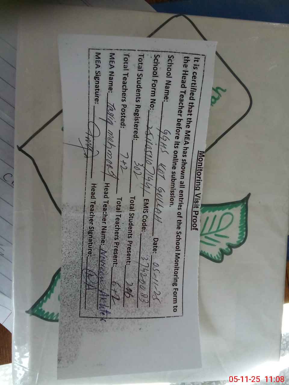 | Attendance Register | Head Teacher | MEA with School | Visit Proof |