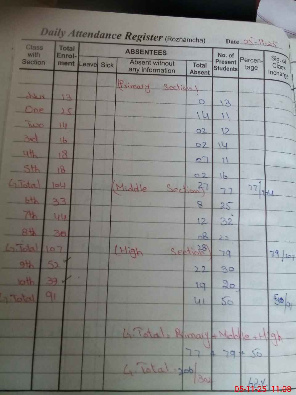 | Total Students Present | 0 | 0 | 13 | 11 | 12 | 14 | 11 | 16 | 25 | 32 | 22 | 30 | 20 | 206 | ||