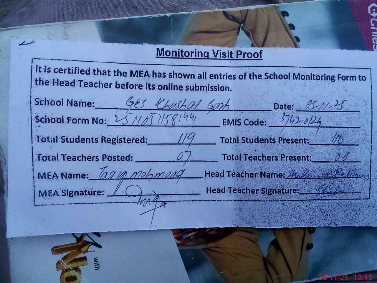 | Attendance Register | Head Teacher | MEA with School | Visit Proof |