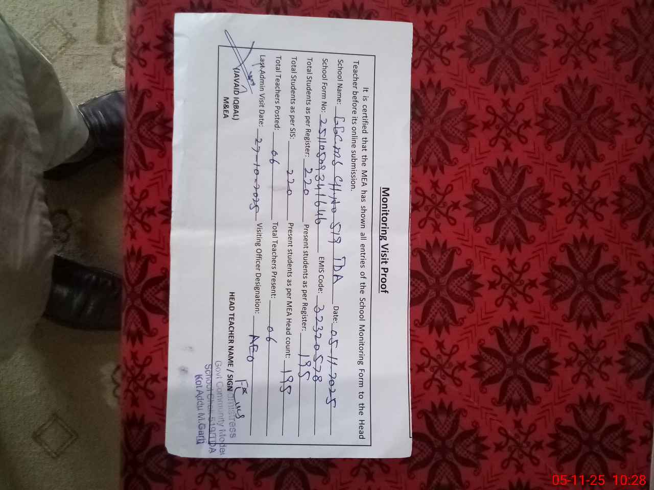 | Certified that this School was Inspected by the Undersigned MEA/DMO Today and the Information Stated Above is as Per Record. | |||||