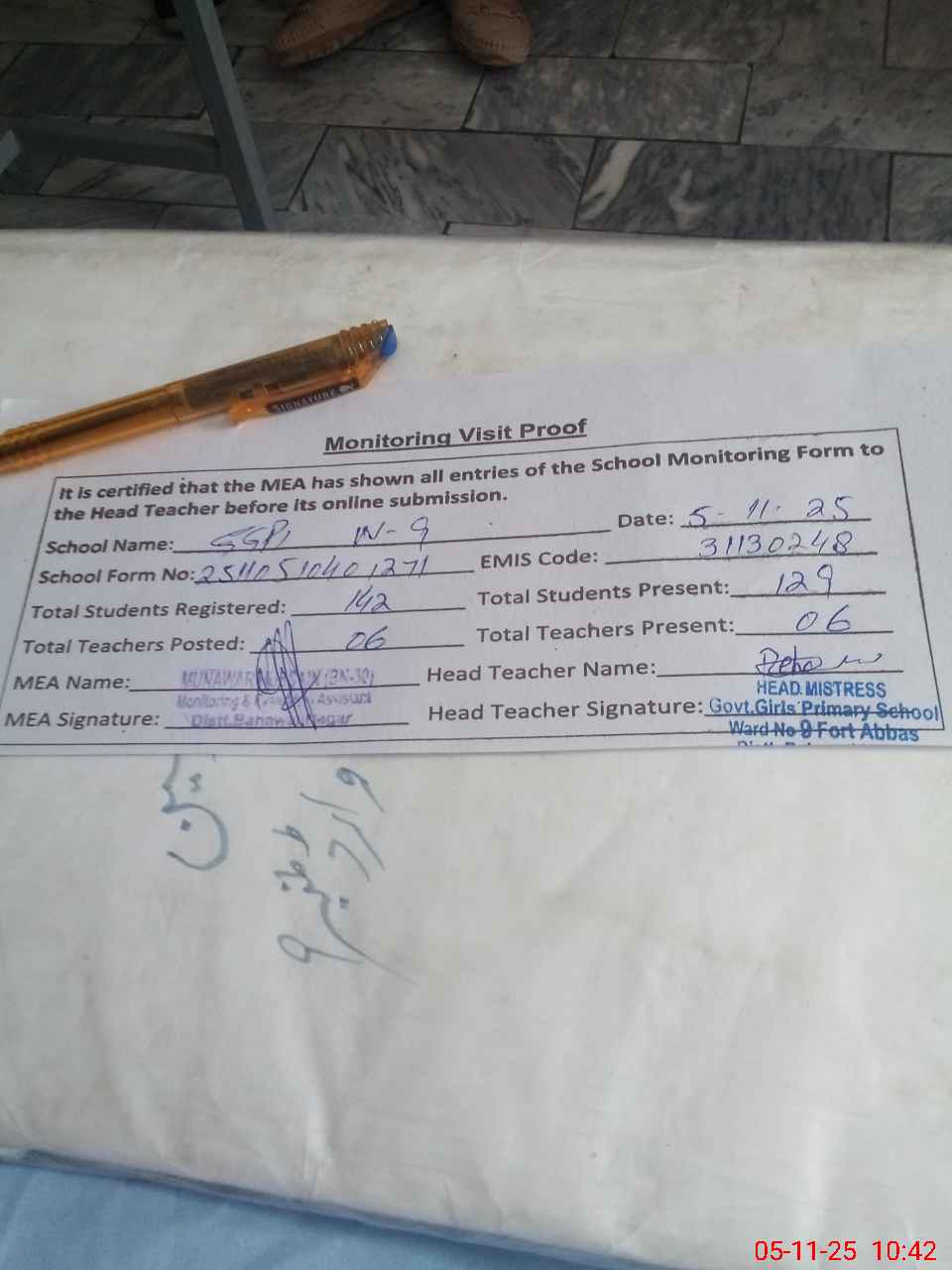 | Attendance Register | Head Teacher | MEA with School | Visit Proof |