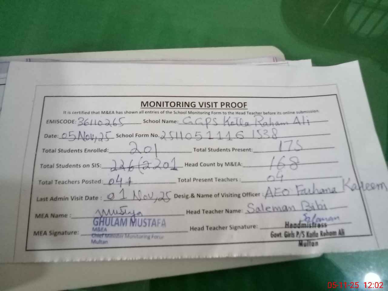 | Monitoring Date: 05-11-2025 | Start Time: 05-11-2025 11:16 AM | End Time: 05-11-2025 12:09 PM | Name of MEA: Gh**** Mu**** | |