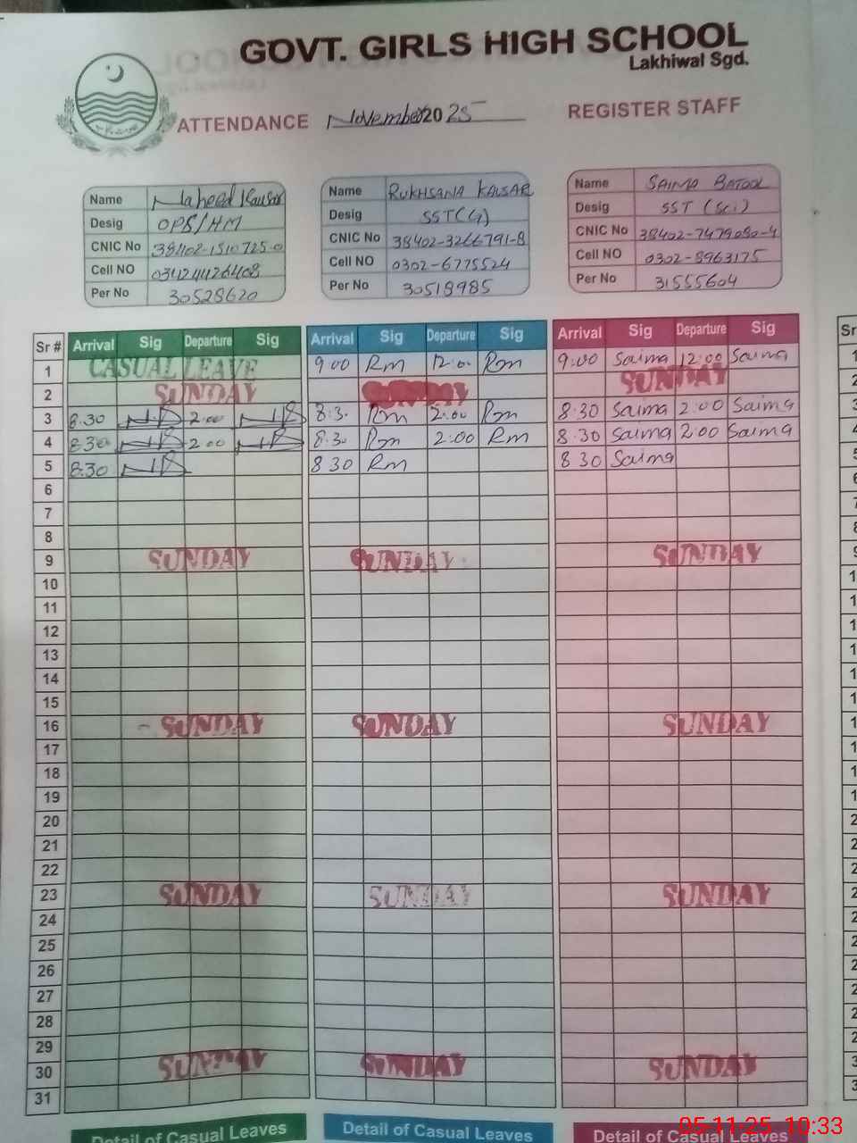 | CNIC | Full Name | Designation | R/C | Absence During Last Calender Month |