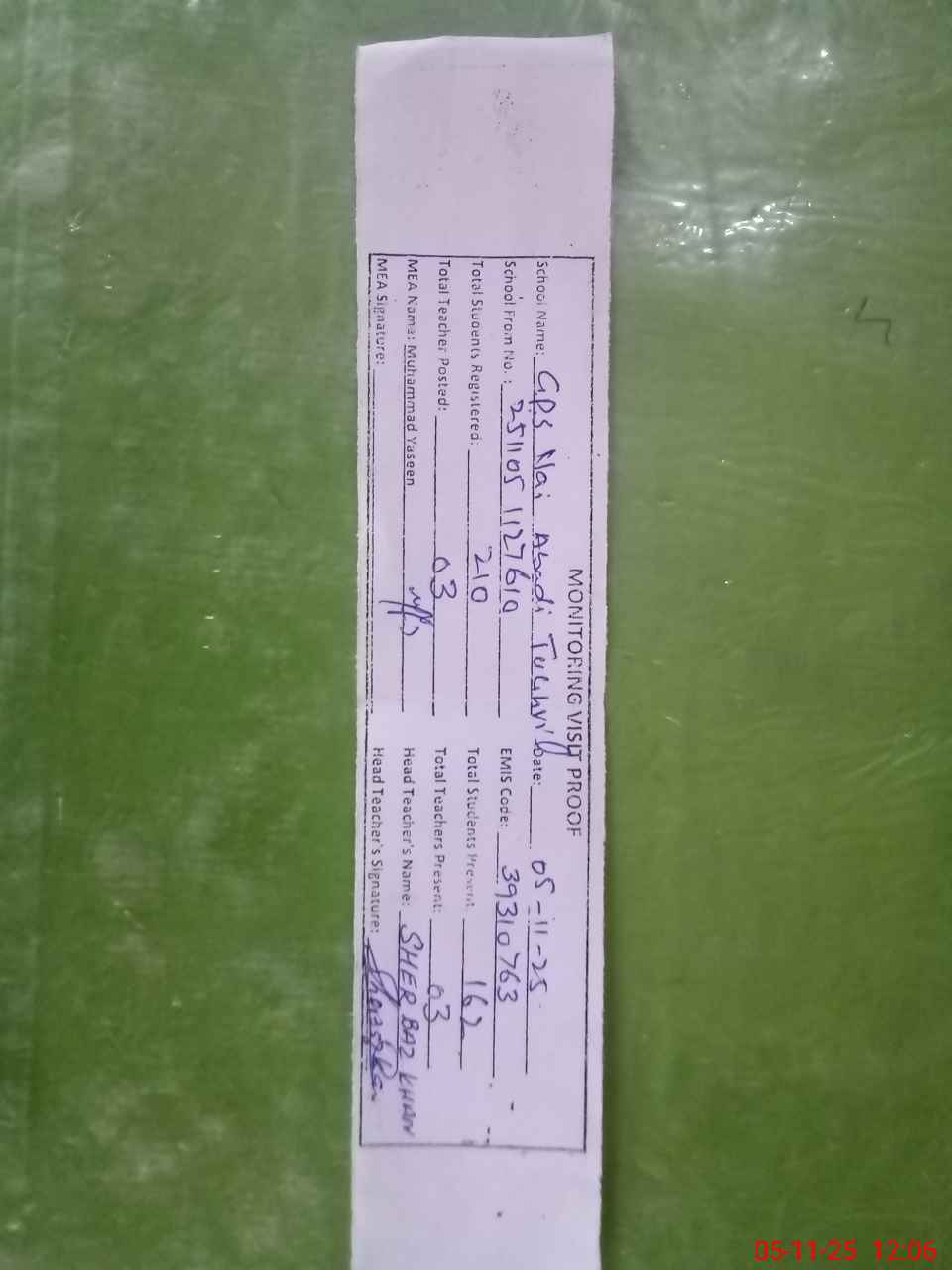 | Attendance Register | Head Teacher | MEA with School | Visit Proof |