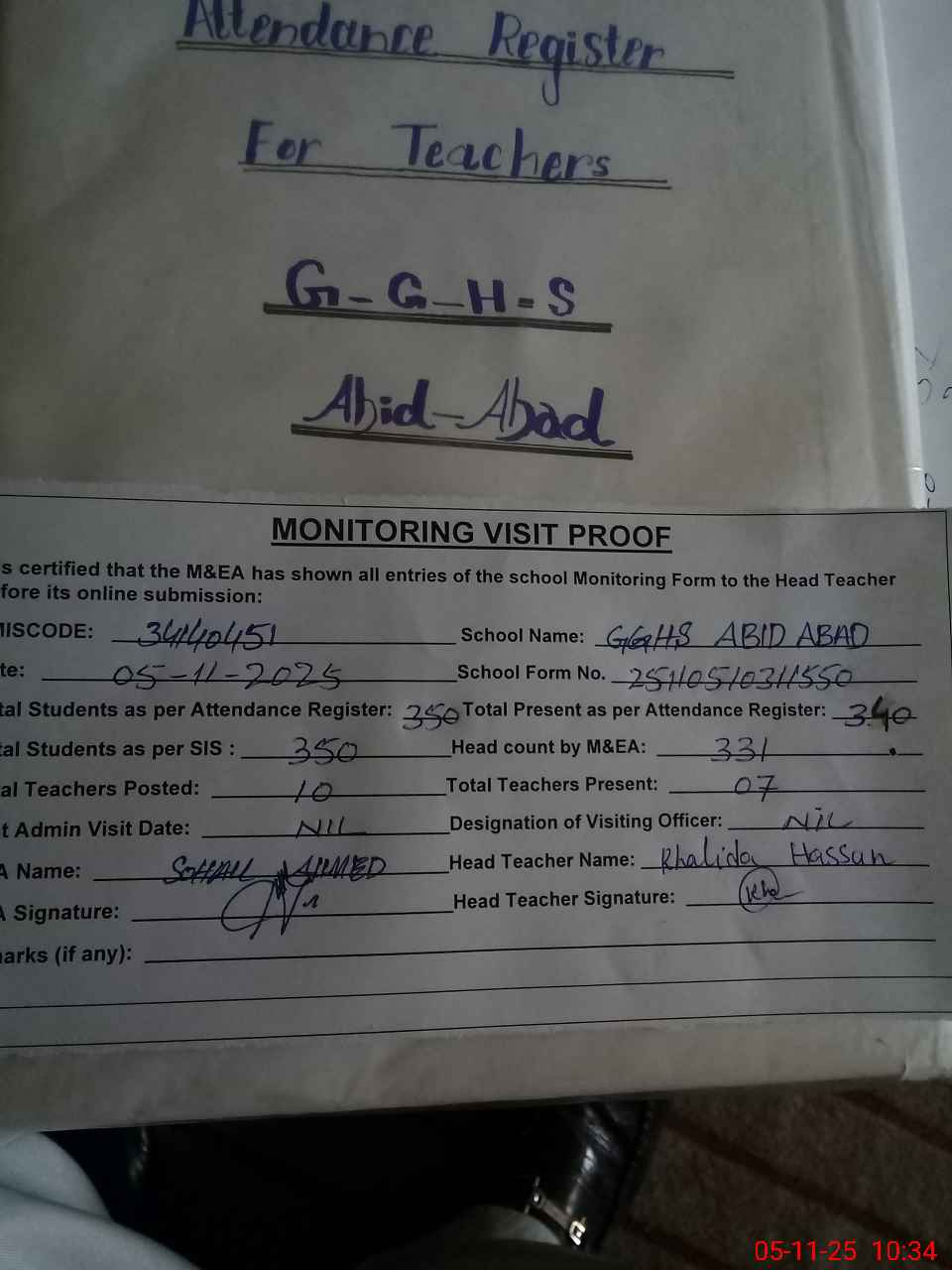 | Attendance Register | Head Teacher | MEA with School | Visit Proof |