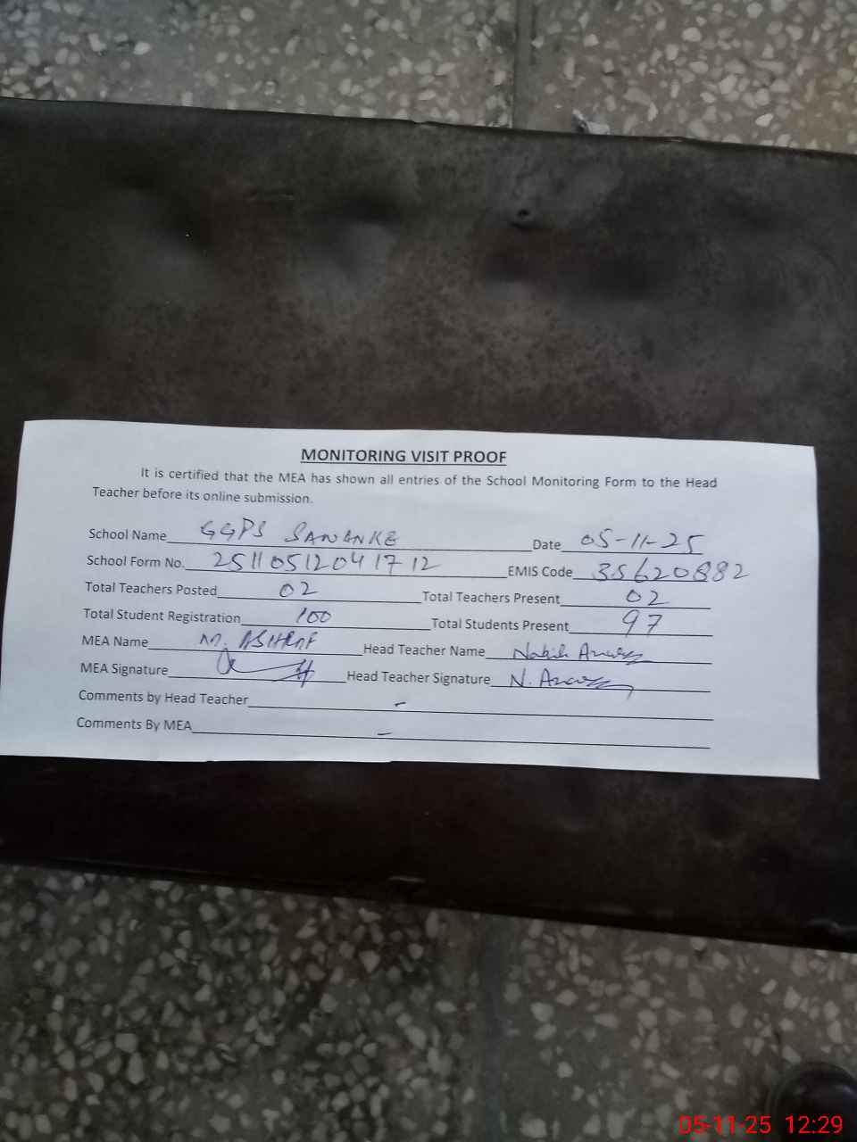 | Attendance Register | Head Teacher | MEA with School | Visit Proof |